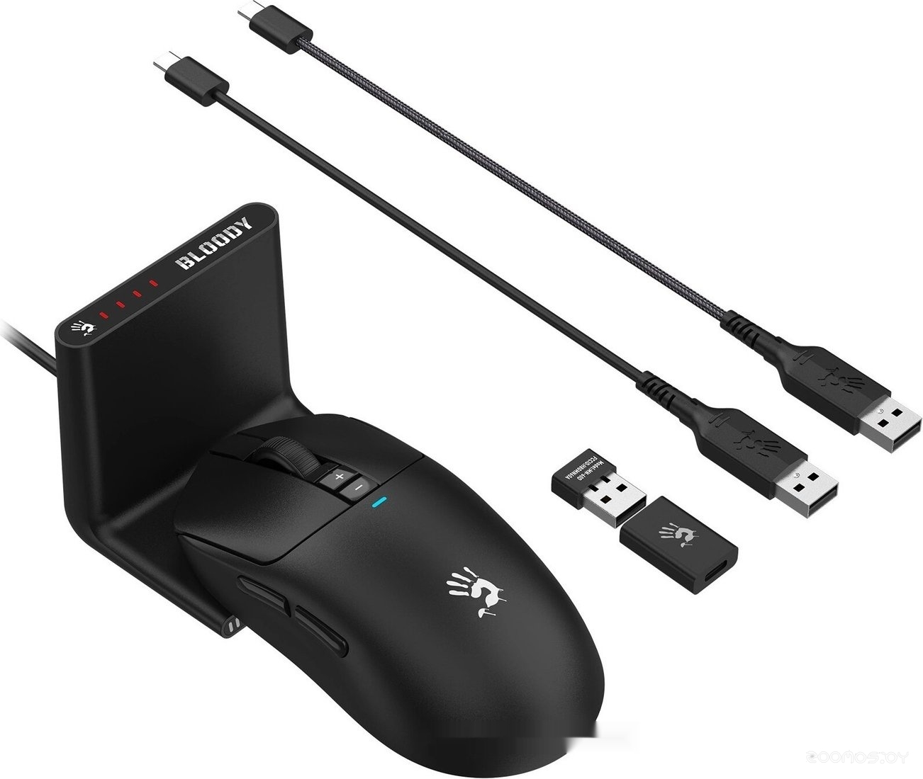 Комплектация: USB-приемник, гриптейпы, сменные глайды, удлинитель USB-приемника, кабель для зарядки/проводного подключения, док-станция для зарядки, документация