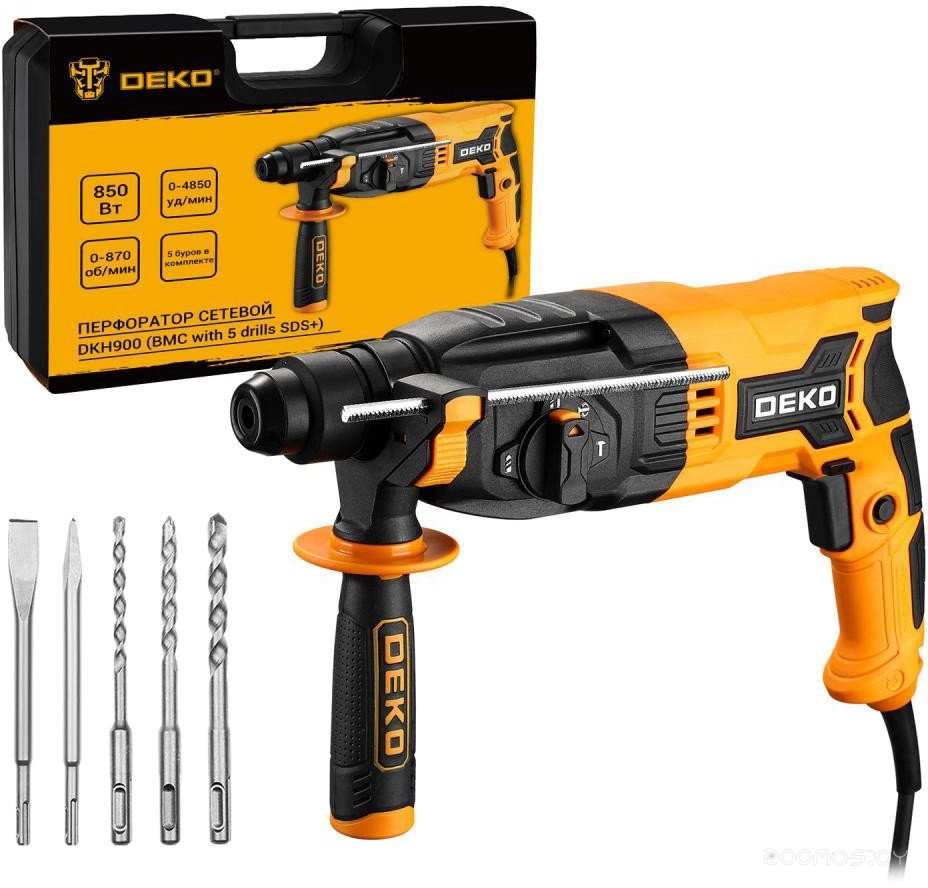 Описание набора: Перфоратор; - Бур - 3 шт; - Долото - 2 шт; - Ограничитель глубины; - Инструкция; - Кейс.