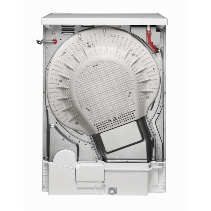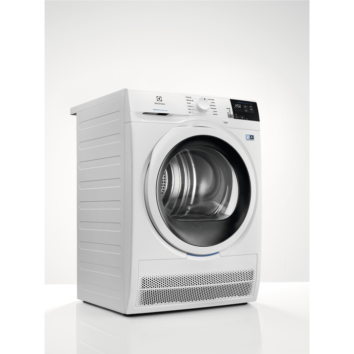 Сушильная машина Electrolux белого цвета с люком, который также выполнен в белом цвете. Он был классифицирован как продукт класса энергопотребления B, что означает, что он будет потреблять меньше энергии по сравнению с другими сушилками той же категории. Класс сушки также получил оценку B, что означает, что он эффективен при сушке белья.