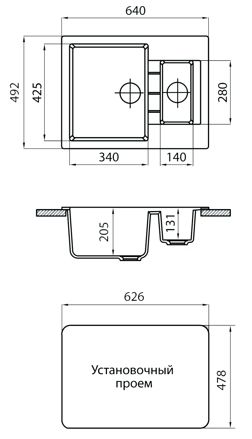 Ширина монтажного отверстия под мойку 63 см