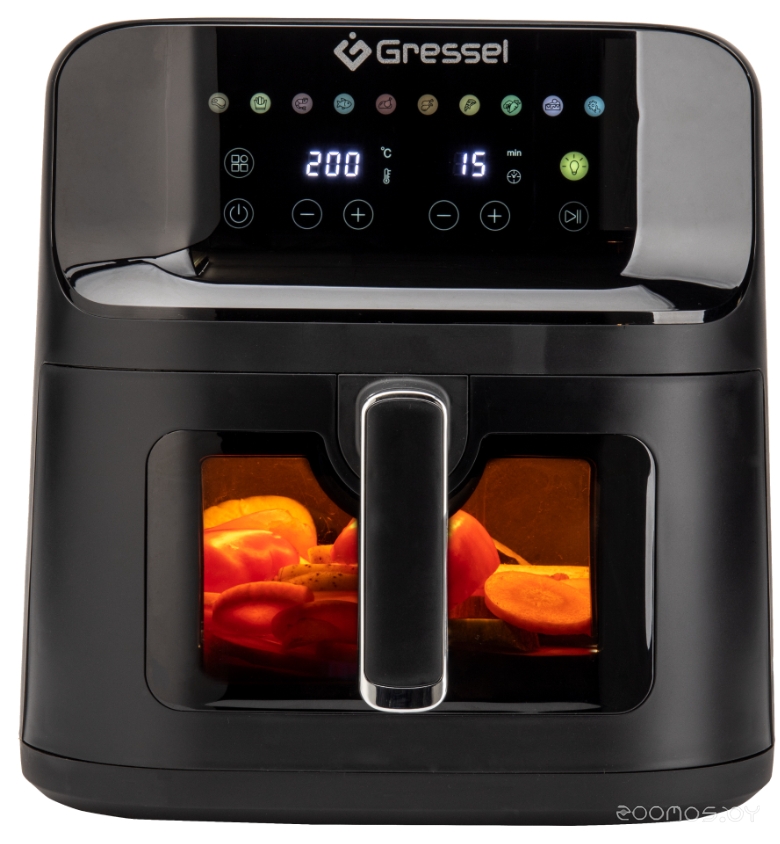 Программы приготовления: овощи, пицца, рыба, стейк, картофель фри, выпечка, сушка овощей и фруктов, размораживание, курица, морепродукты