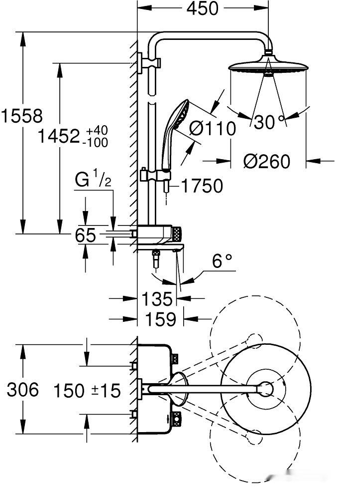 | Вылет верхнего душа | 450 мм | ||