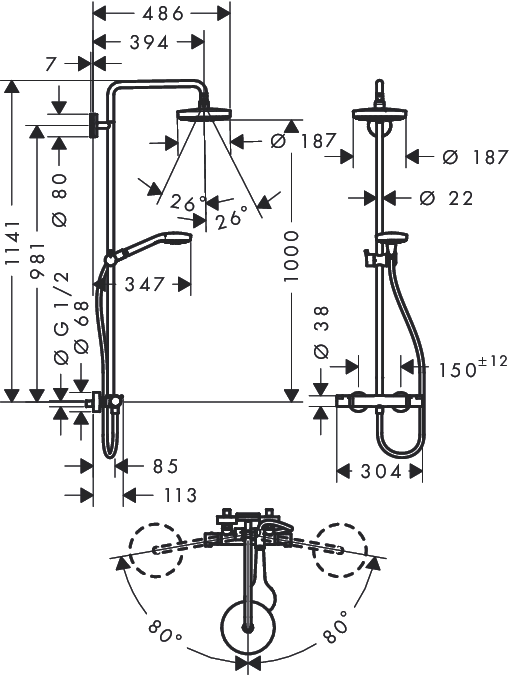 Вылет верхнего душа: 394 мм