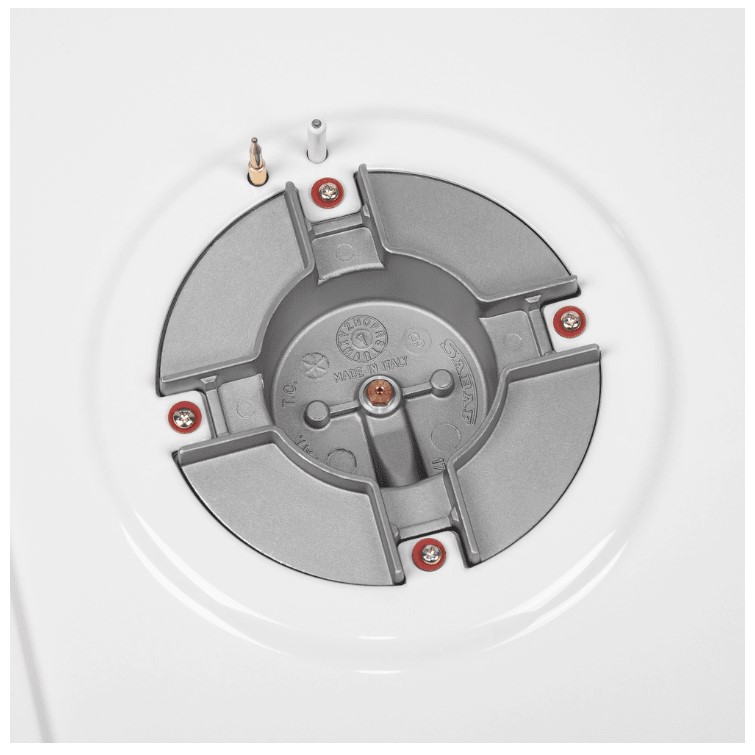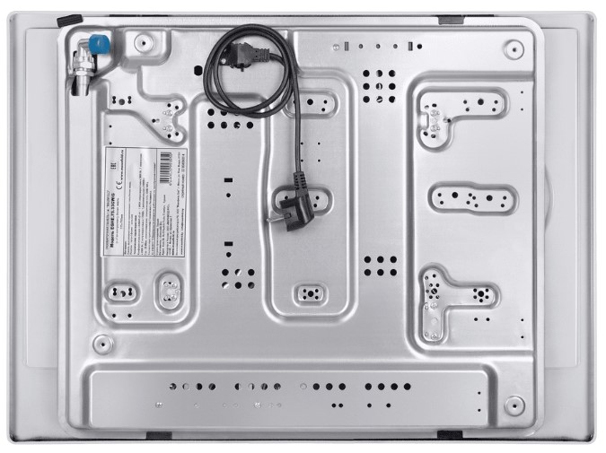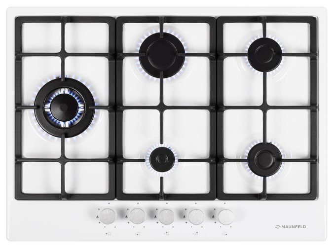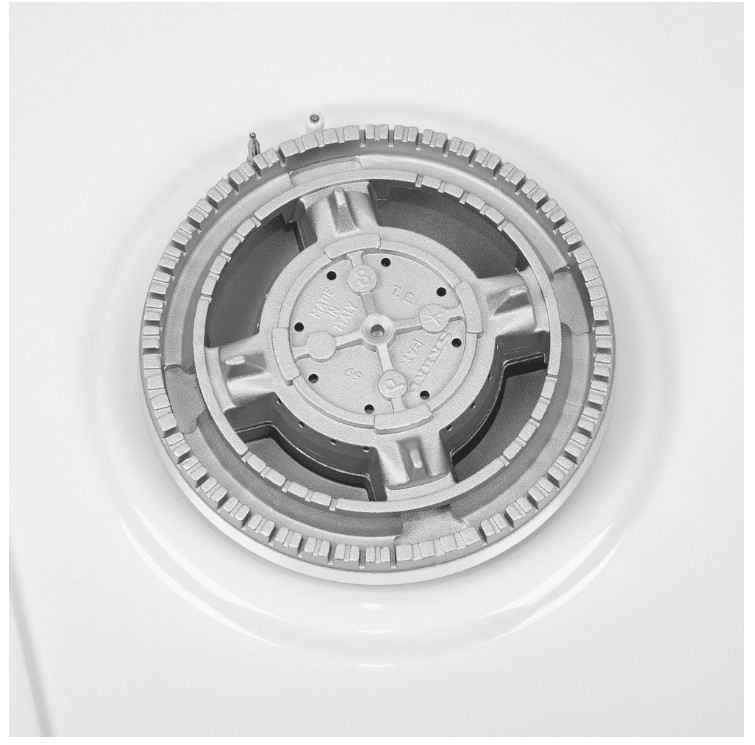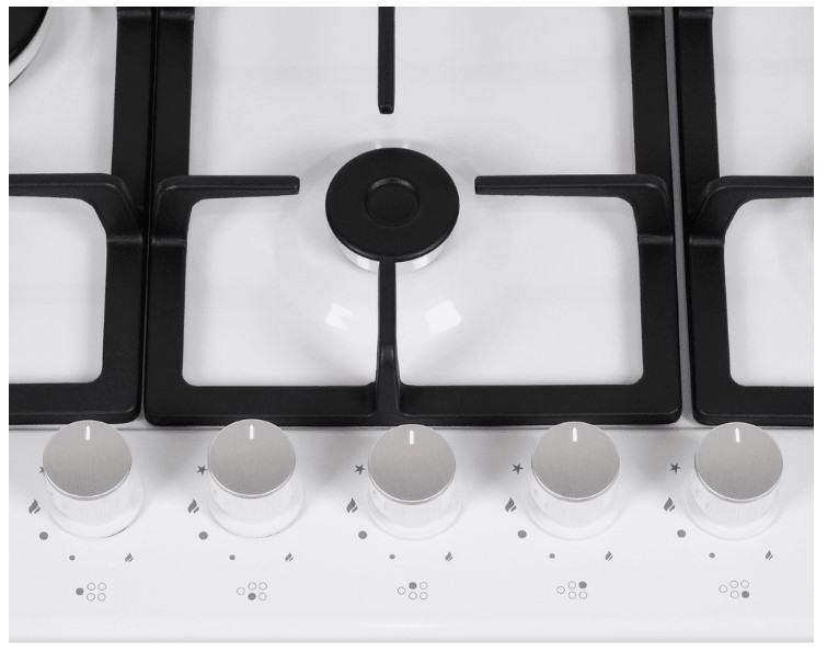 Панель выполнена из нержавеющей стали, покрытой термостойкой прочной эмалью белого цвета. В данной модели установлены высококачественные итальянские горелки SABAF. Четыре стандартные конфорки разного диаметра мощностью 1000 Вт, 1700 Вт, 1700 Вт, 2600 Вт и 1 сверхмощная WOK-конфорка с двойным пламенем мощностью 3800 Вт, расположенная на левой части панели.