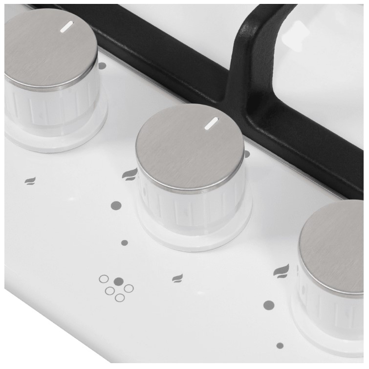Регулирование подачи газа и электроподжиг конфорок производится с помощью поворотных регуляторов. Ручки из высокопрочного термостойкого пластика белого цвета располагаются по центру панели. Около каждой есть информационные изображения: используемая конфорка, подача газа выключена, электроподжиг, максимальное пламя и минимальное пламя.