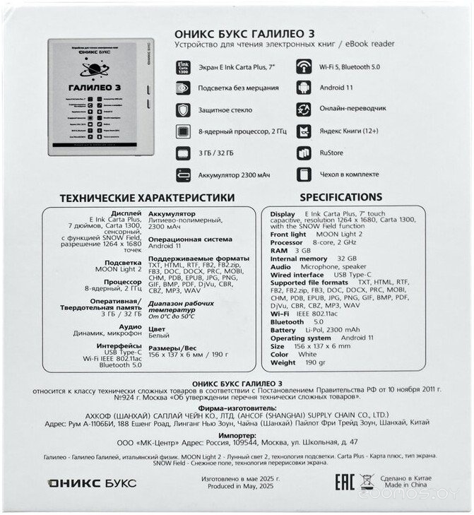 Производитель: Onyx. Артикул: BOOX Галилео 3 (белый)