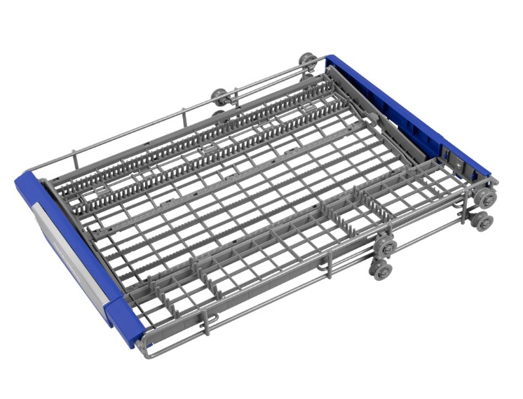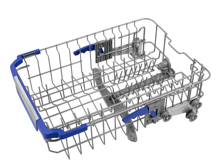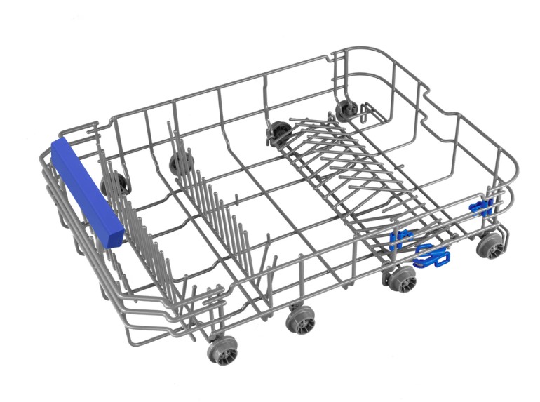 Опустить или поднять верхнюю полку можно всего одним нажатием рычага. Размещать посуду нестандартных размеров будет ещё проще.