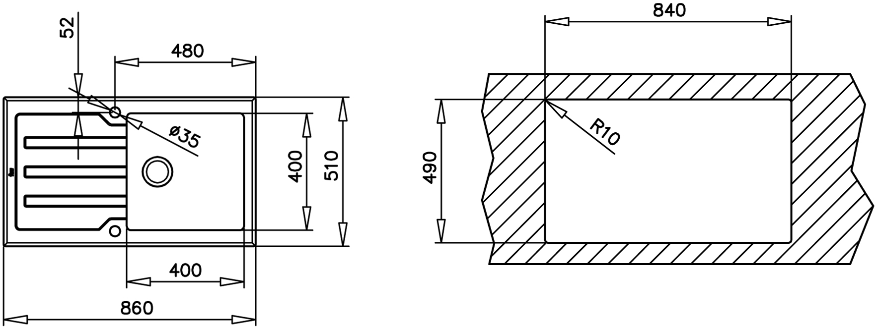 | Глубина монтажного отверстия под мойку | 49 см | ||