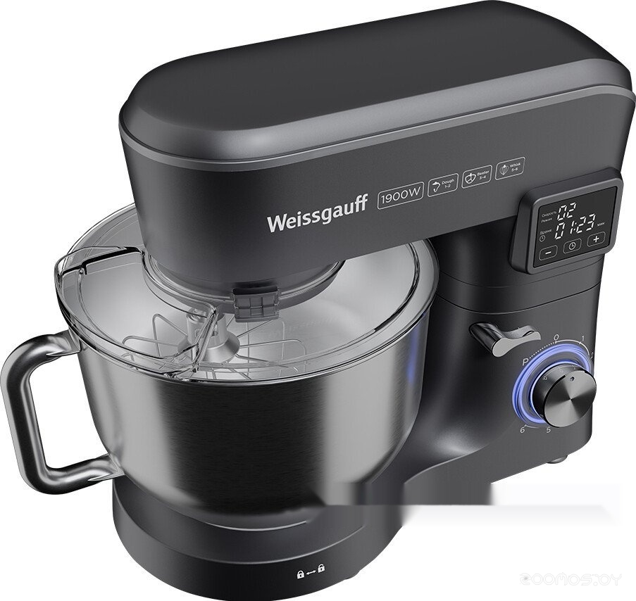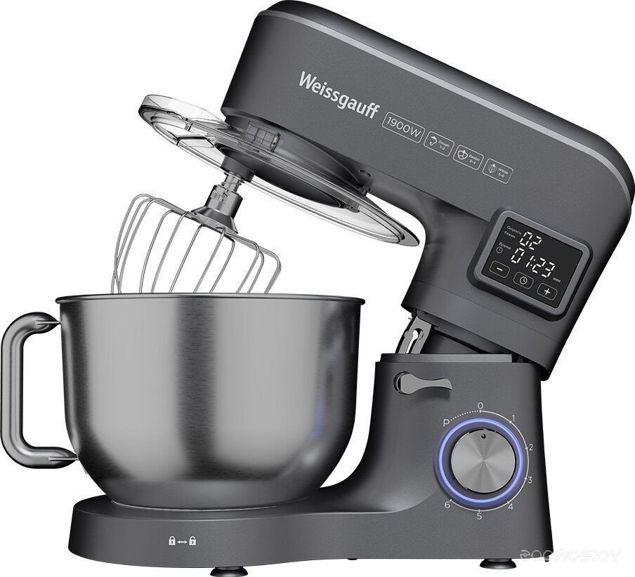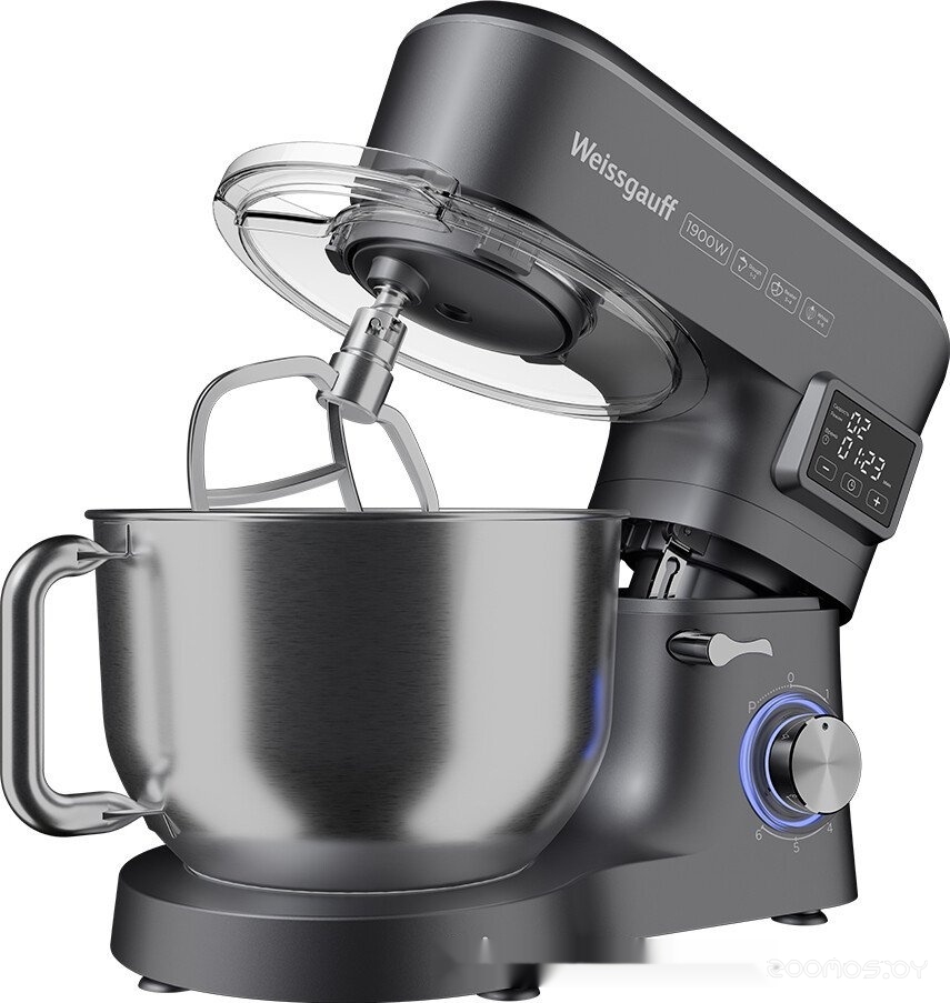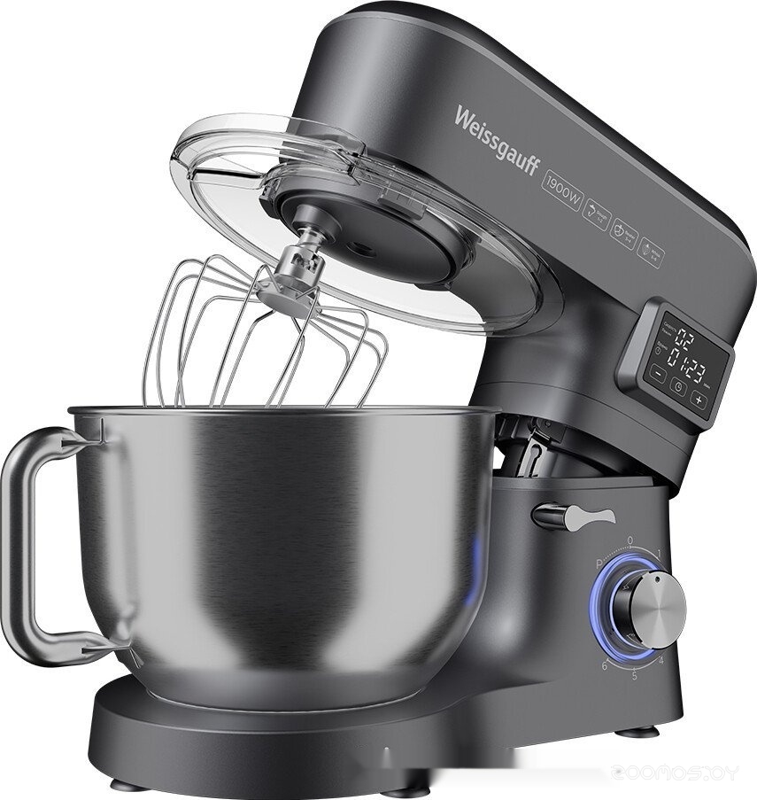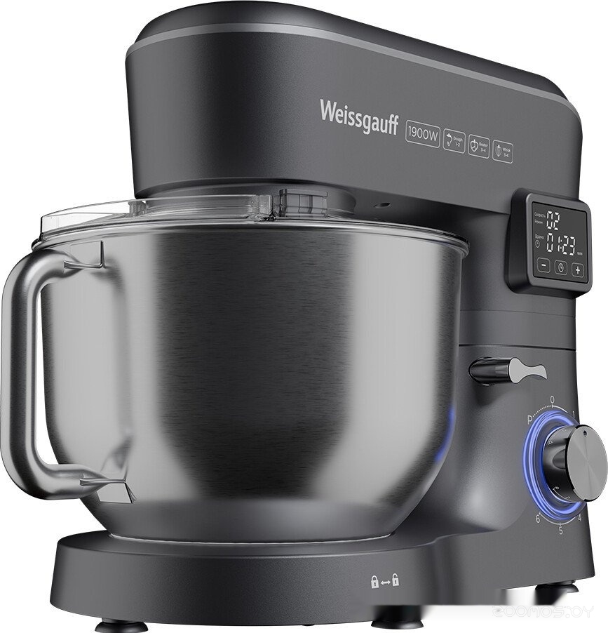 | Комплектация | чаша из нержавеющей стали 6 л с крышкой-экраном от брызг и отсеком для добавления продуктов, насадка для смешивания, насадка для теста, венчик для взбивания, цифровой дисплей, руководство пользователя | ||
