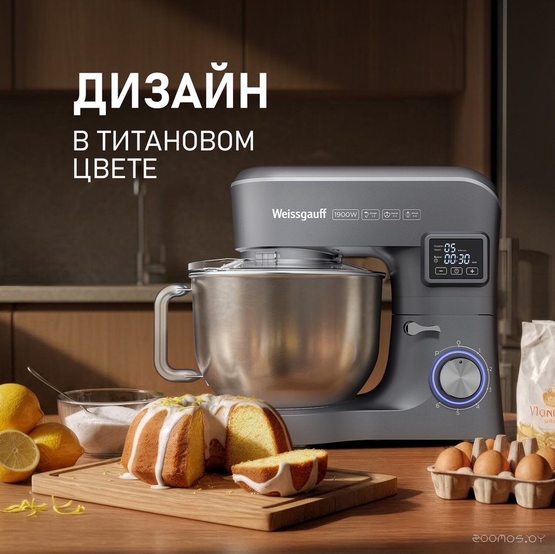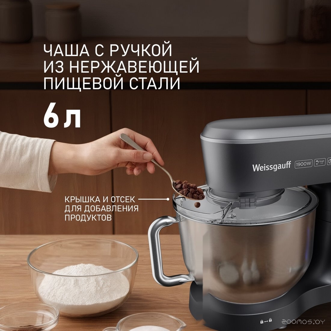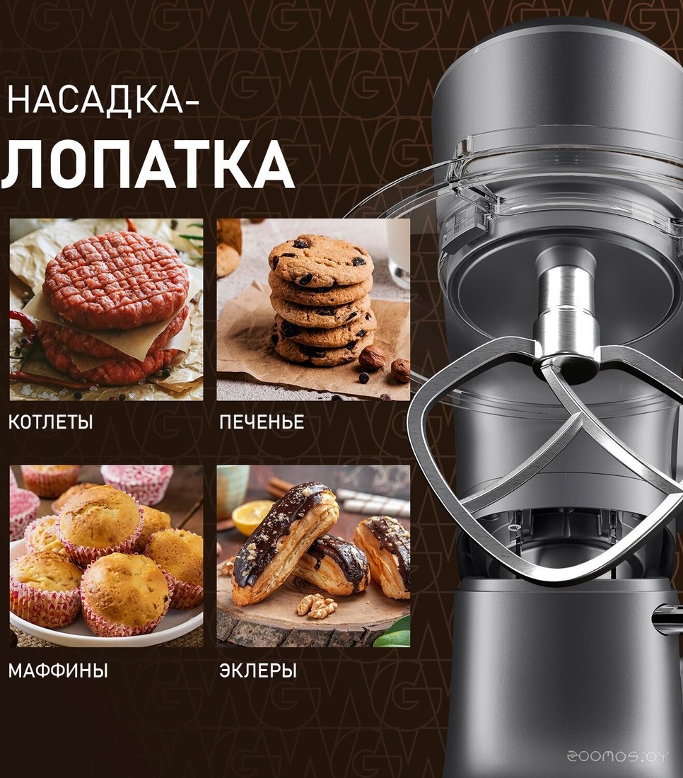 | Комплектация | чаша из нержавеющей стали 6 л с крышкой-экраном от брызг и отсеком для добавления продуктов, насадка для смешивания, насадка для теста, венчик для взбивания, цифровой дисплей, руководство пользователя | ||