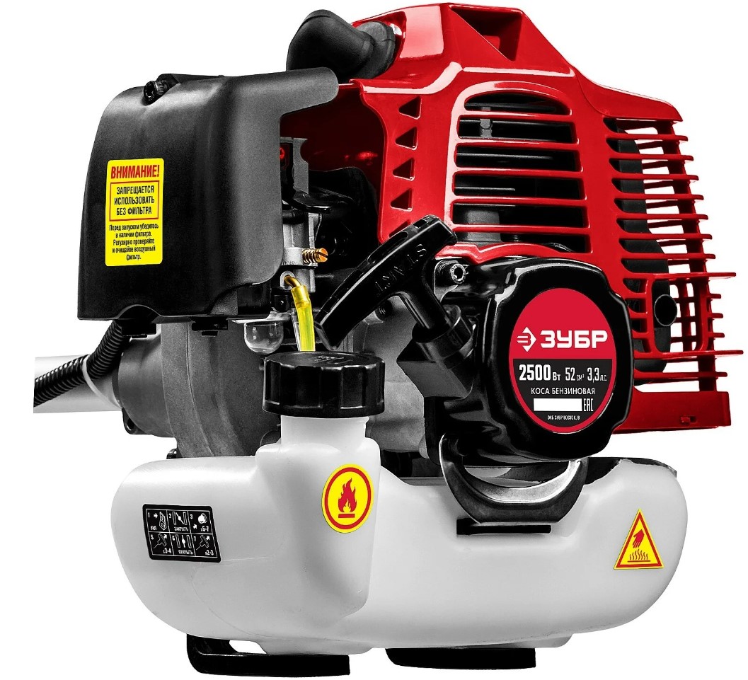 Двигатель Зубр КРБ-2500 расположен вверху, что значительно снижает уровень шума при работе. Рабочий объем двигателя составляет 52 куб. см, что довольно много и позволяет работать с высокой скоростью резания.